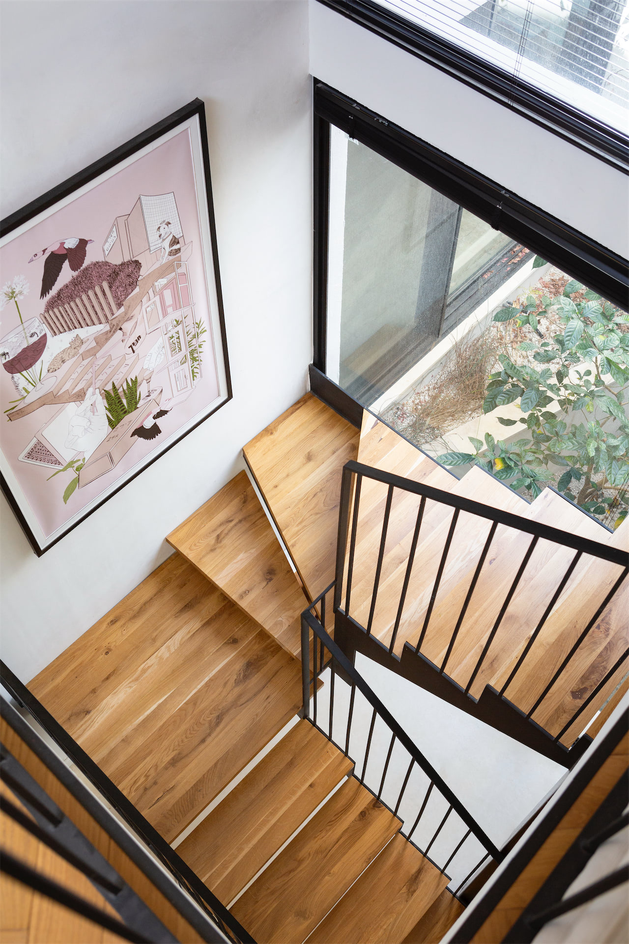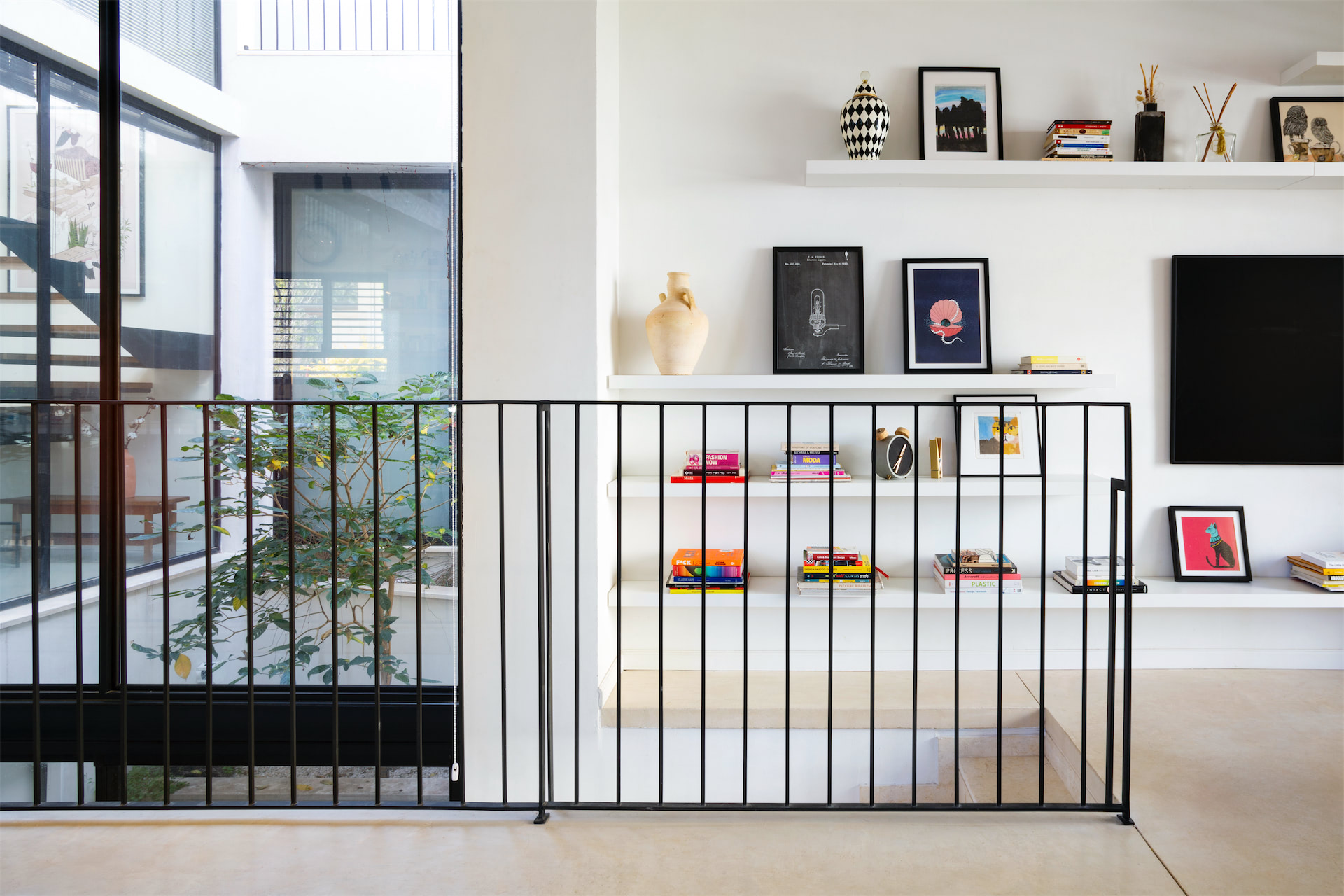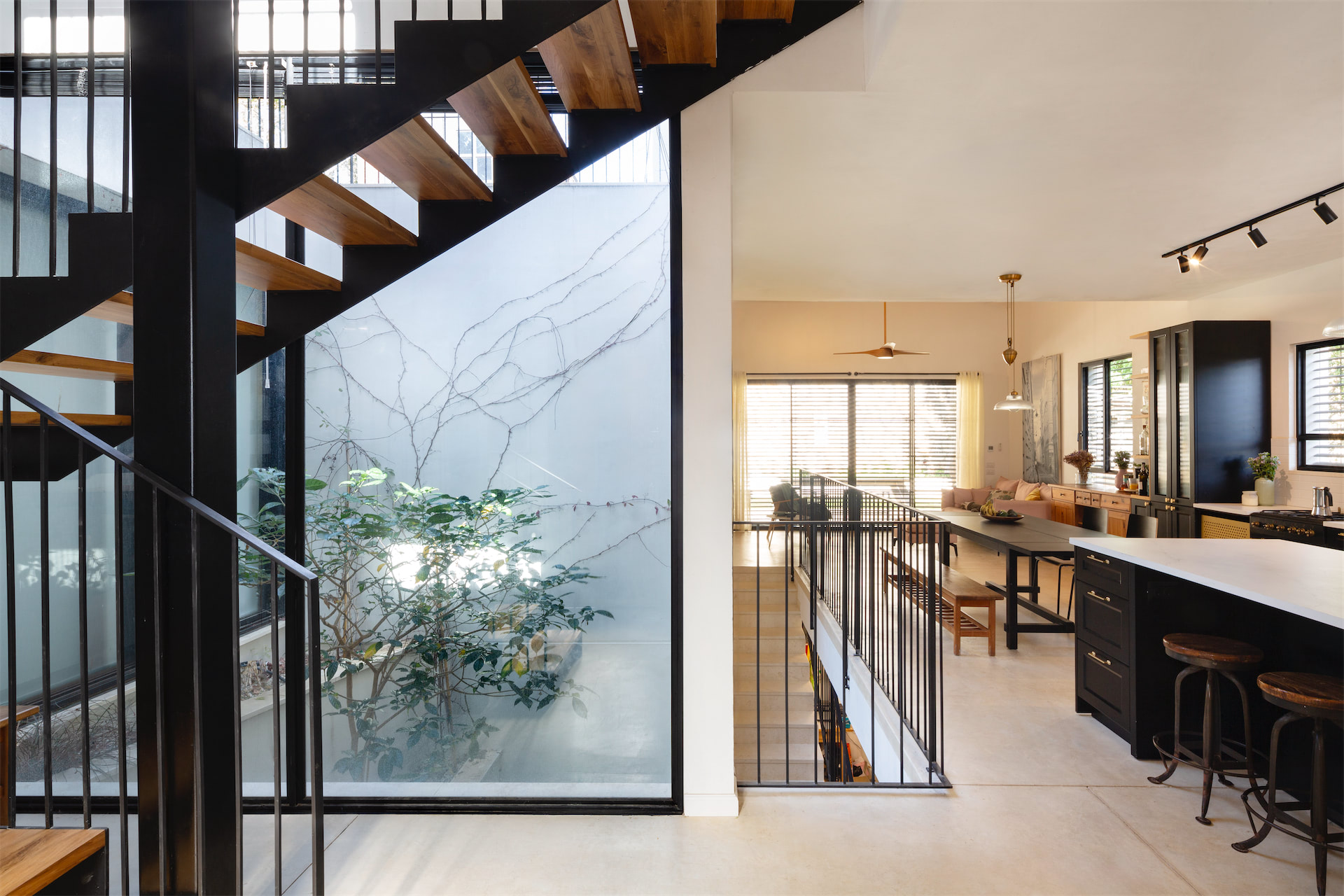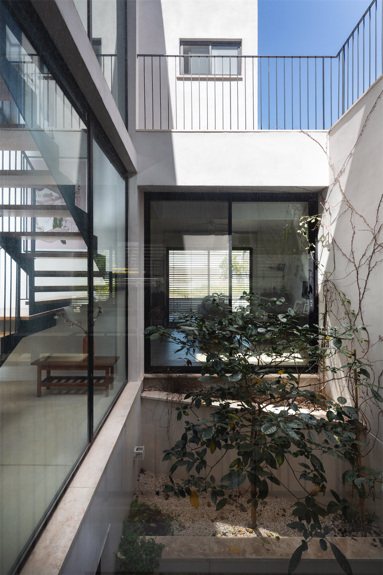 הפטיו עובר לאורך כל שלוש הקומות בבית: הוא מתחיל במרתף ומכניס אור טבעי ואוורור; ממשיך בקומת הקרקע עם שלוש חזיתות זכוכית שמאפשרות שקיפות וזרימת מבטים, אור ואוויר; ומטפס עם גרם המדרגות עד לקומה העליונה ומרפסת הגג הפתוחה.