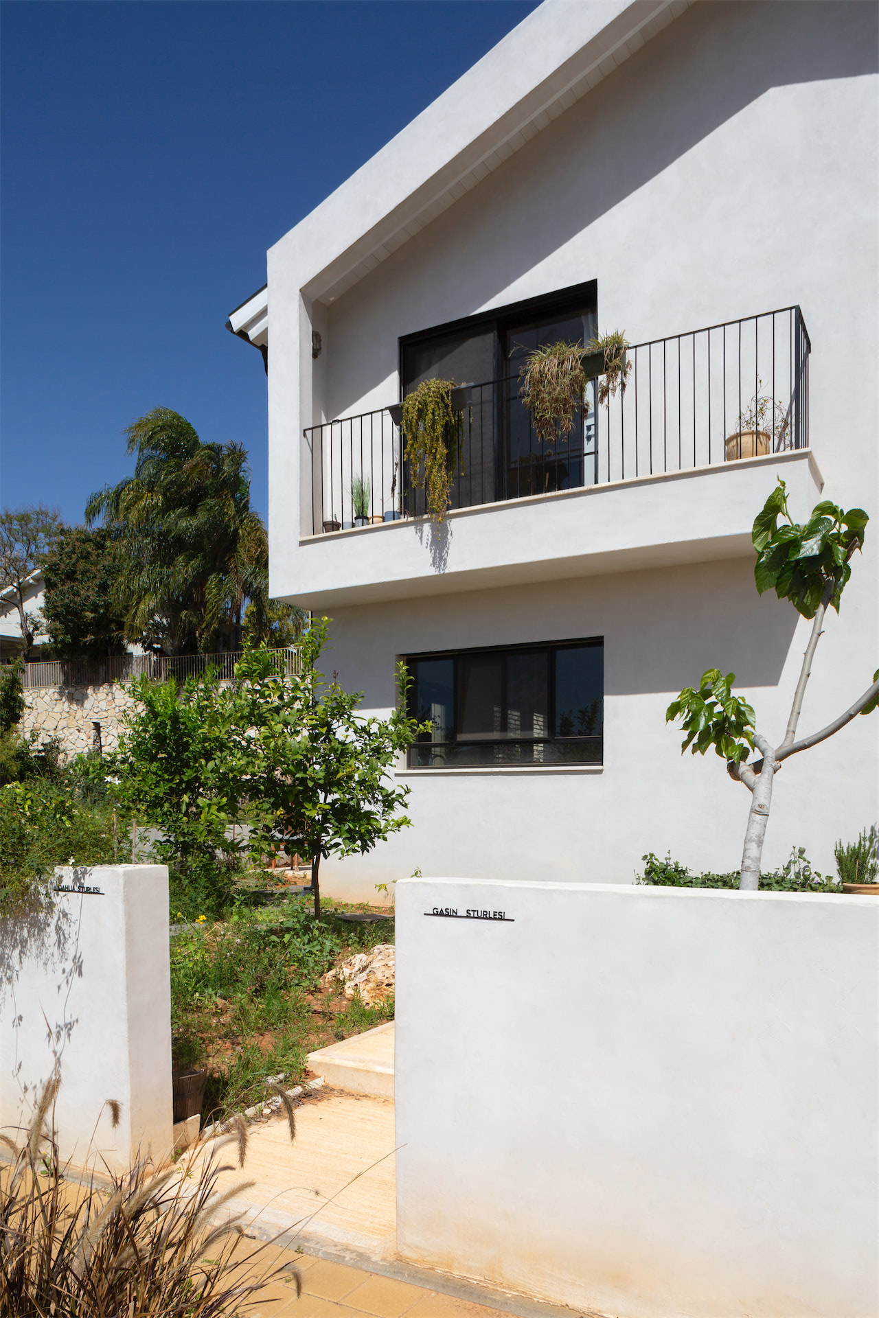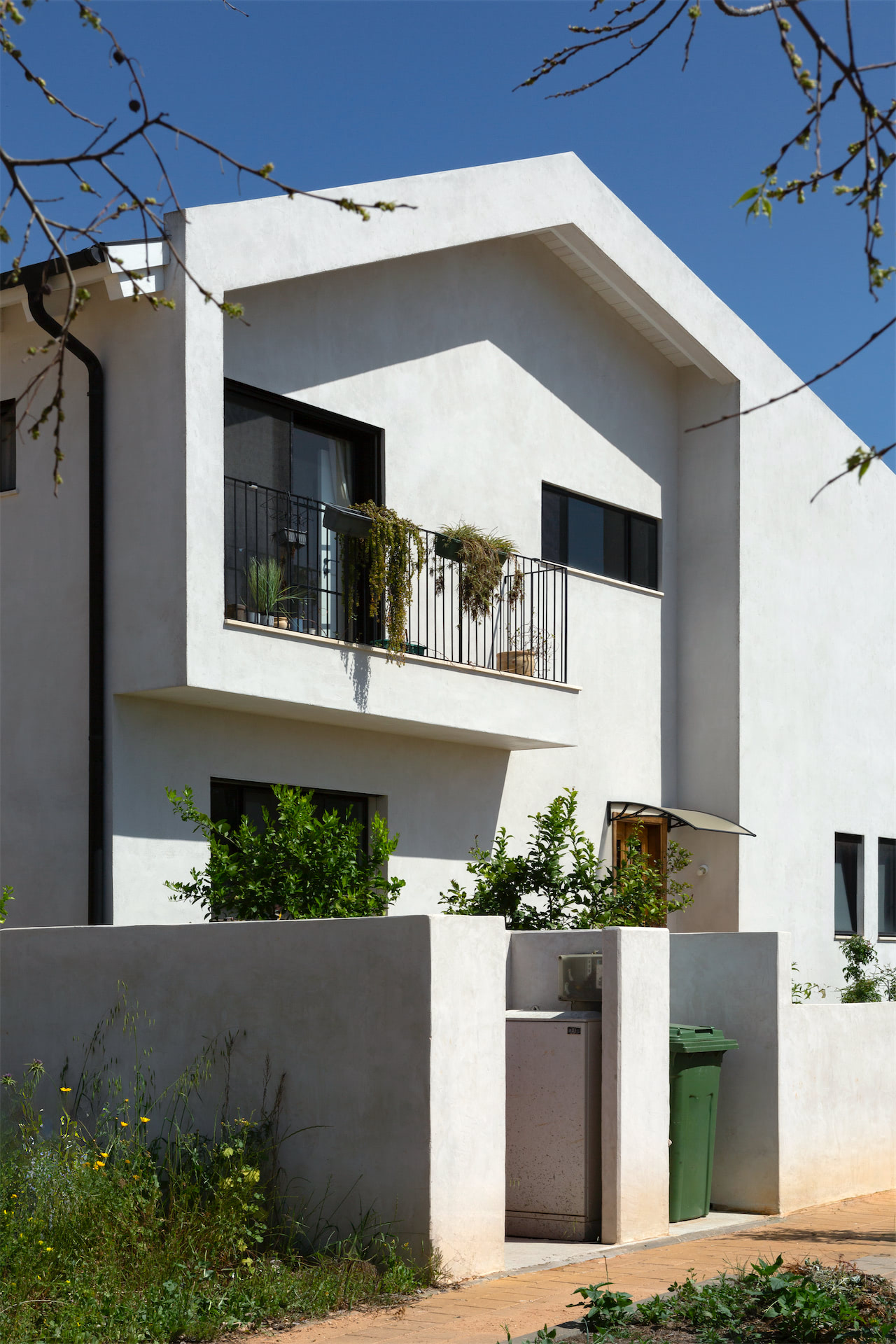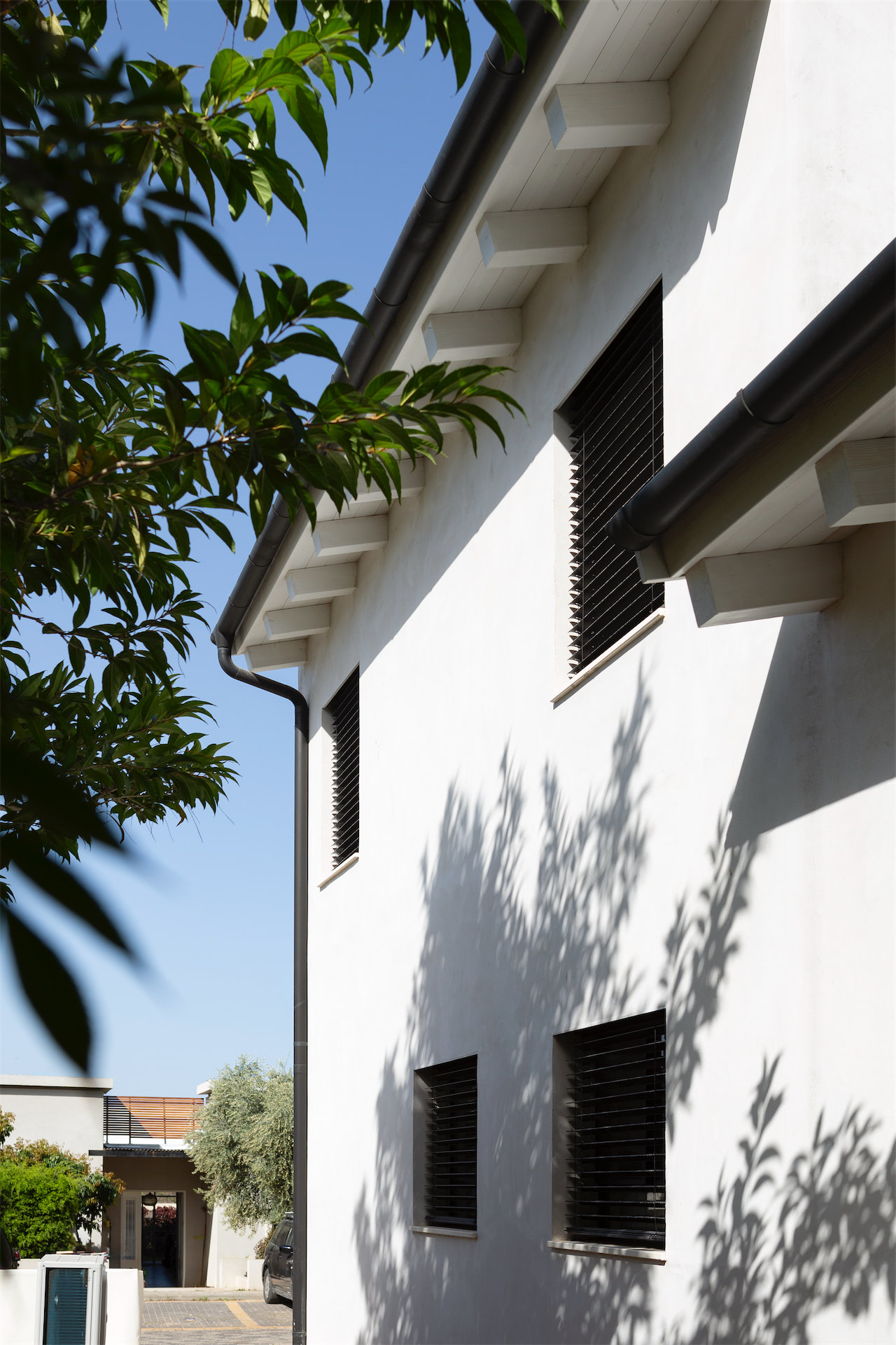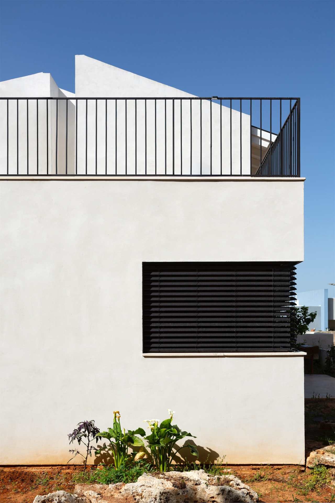 ליבת הבית היא הפטיו: חלל חוץ פנימי שנמתח לכל גובה המבנה ונפתח לשמיים. הוא אינו גלוי מן החזיתות, אך נוכחותו מורגשת היטב בחתך הבית: מרחב חיצוני בלב הפנים, המהווה גם חיץ וגם גשר, מפריד אך מחבר.